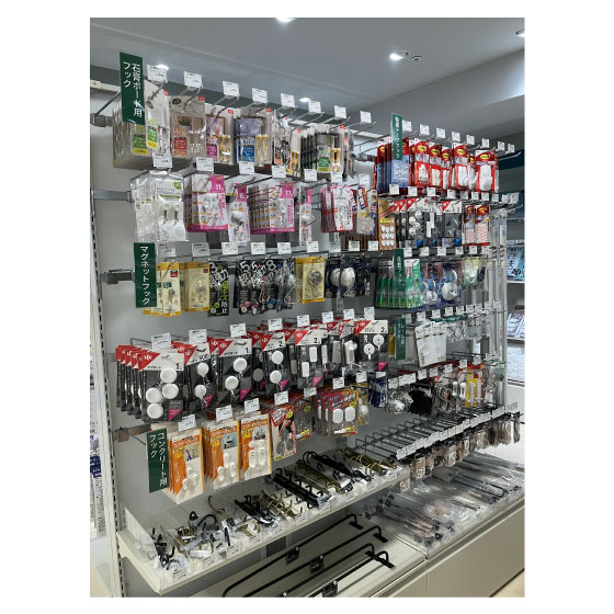 ↑ポスターレール用や石膏ボード用、マグネット、粘着などの各種フックや金物。