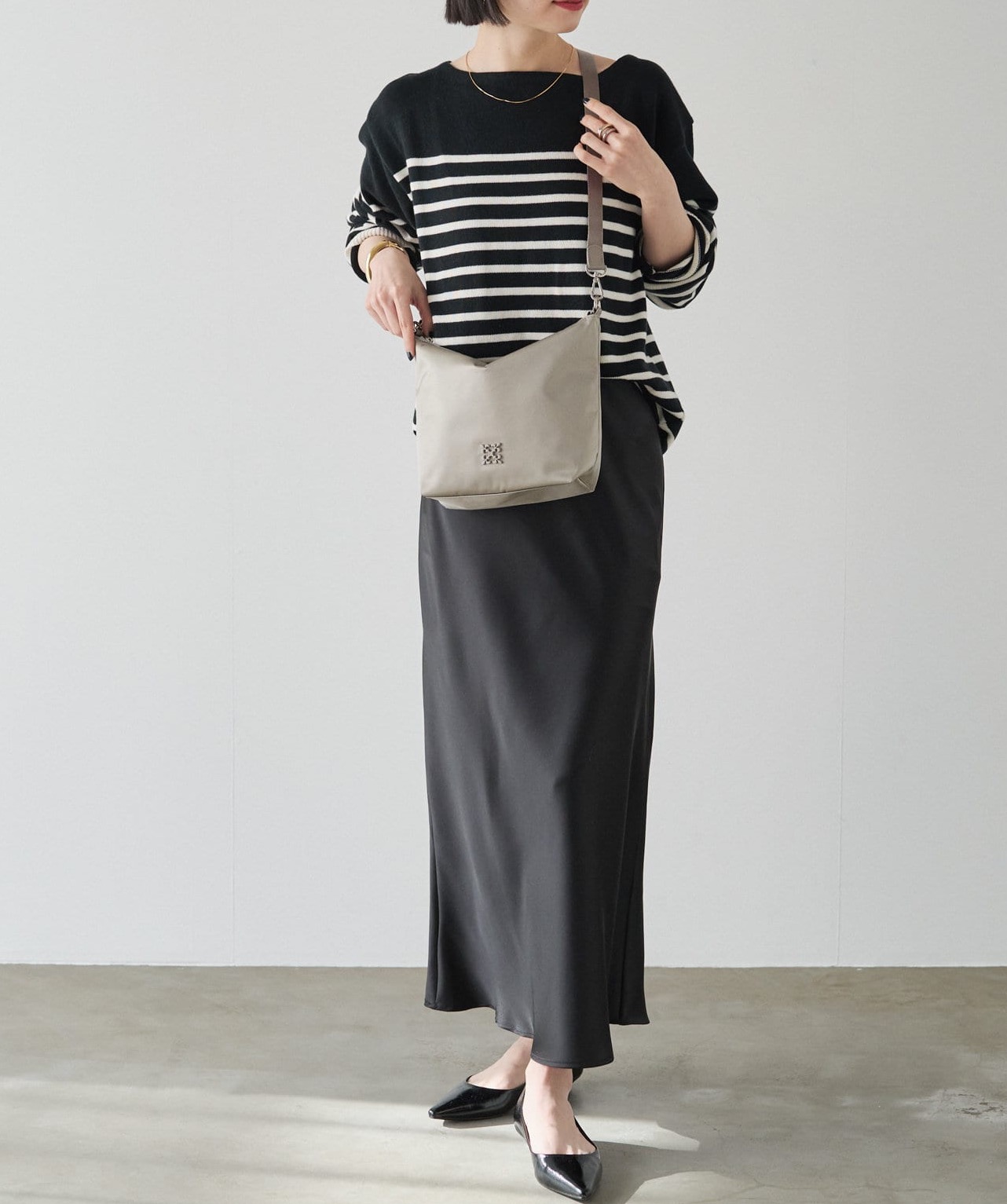 短いレザーベルトでも肩掛けができて、ショルダー持ちでも収まりのすっきりとしたシルエットに。