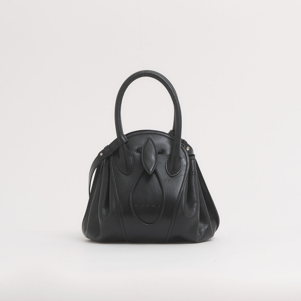 博愛が花言葉のチューリップから着想を得たTULIPEAスモールバッグ。チューリップの蕾がそっと花開く瞬間を思わせるシルエットが特徴的。ほどよい光沢のある柔らかな質感のバッファローレザーを使用。開口部はドローストリング仕様、取り外し可能なショルダーストラップ付き。
