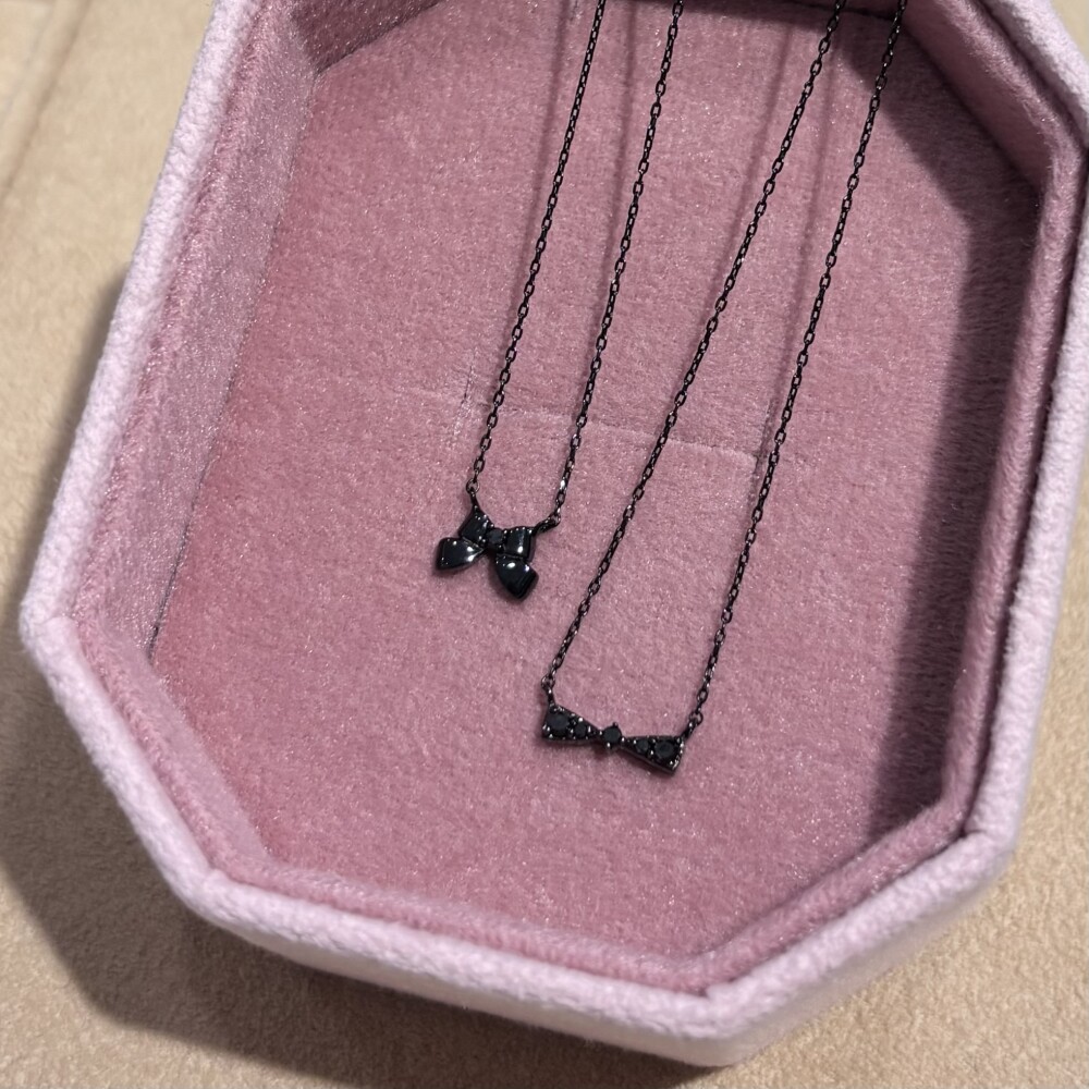 右側のネックレスはリボンの全体にブラックダイヤモンドを入れております。